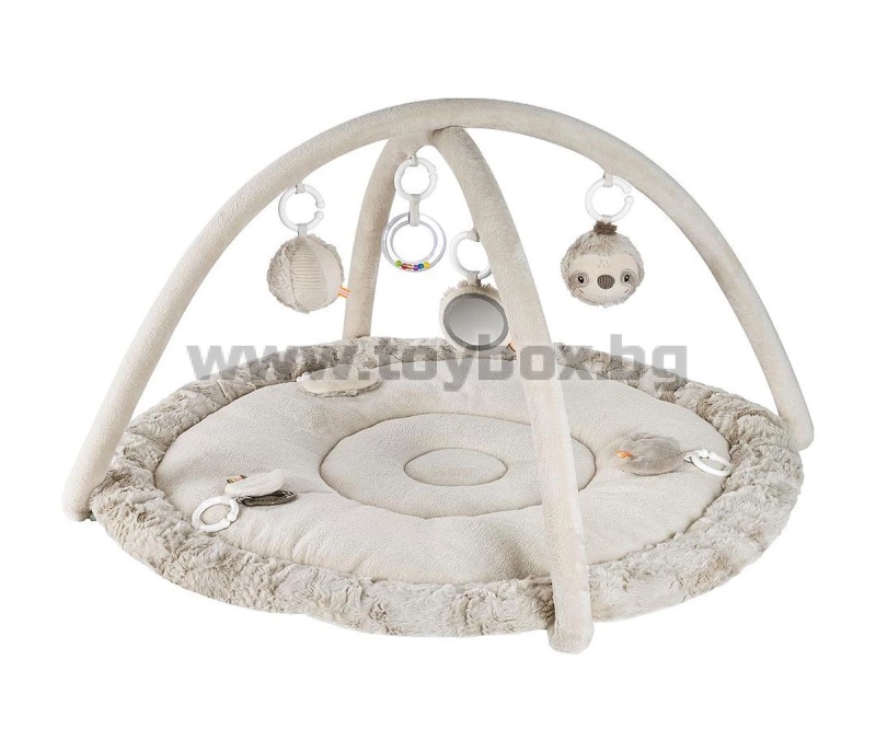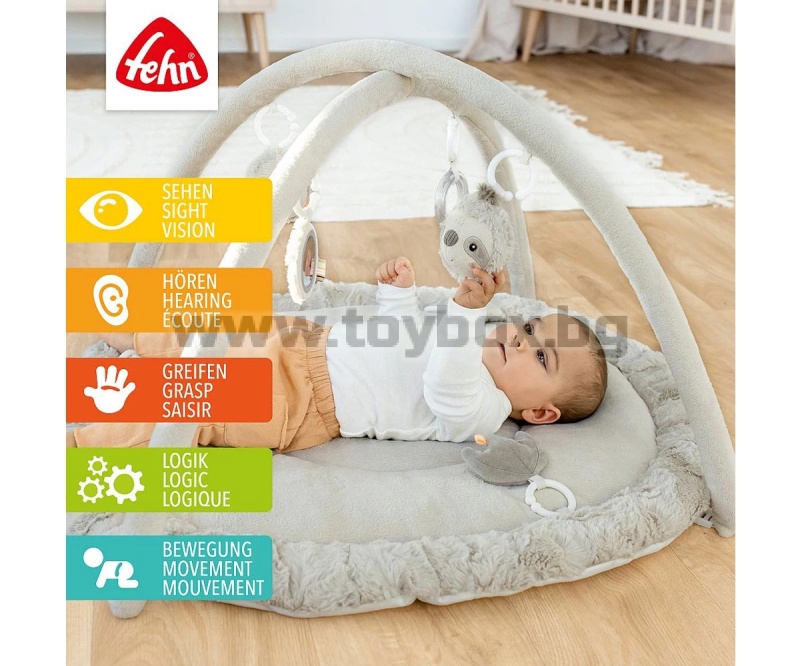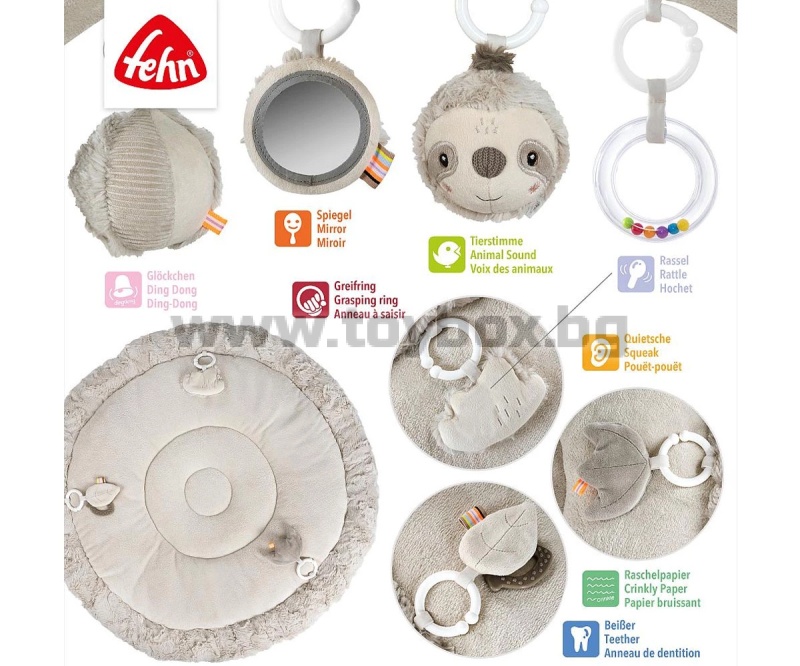 Активна постелка „Ленивец“ – меко приключение за вашето бебе! Меката постелка с площ за игра от различни, приятни на допир материи приканва бебето да усеща, гушка и играе. Три отделящи се елемента с шумолящо фолио, пискалка и дрънкалка стимулират сетивата и координацията между ръка и око. На двата игрови обръча са прикрепени още дрънкалка-пръстен, топка със скрито звънче, огледалце и ленивец с животински звук – за още повече забавление и внимание. Общо 7 различни подвижни елемента предлагат разнообразни възможности за игра, като развиват слуха, допирa и моториката. 3D активната постелка подпомага бебето във всички фази на растеж – по време на лежане, пълзене и сядане, като играта естествено укрепва мускулатурата на гърба и врата.