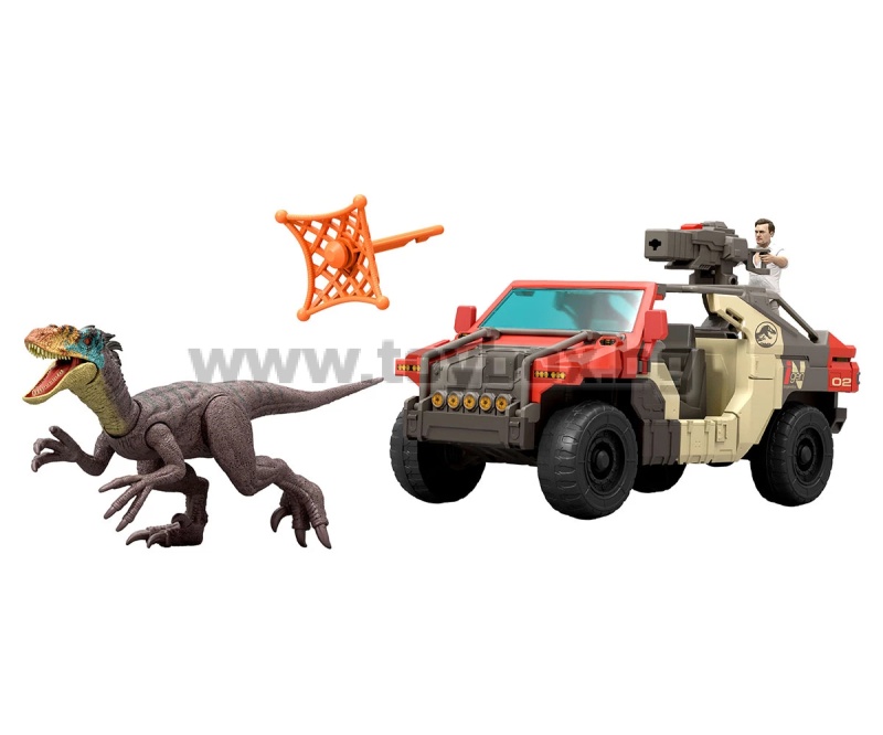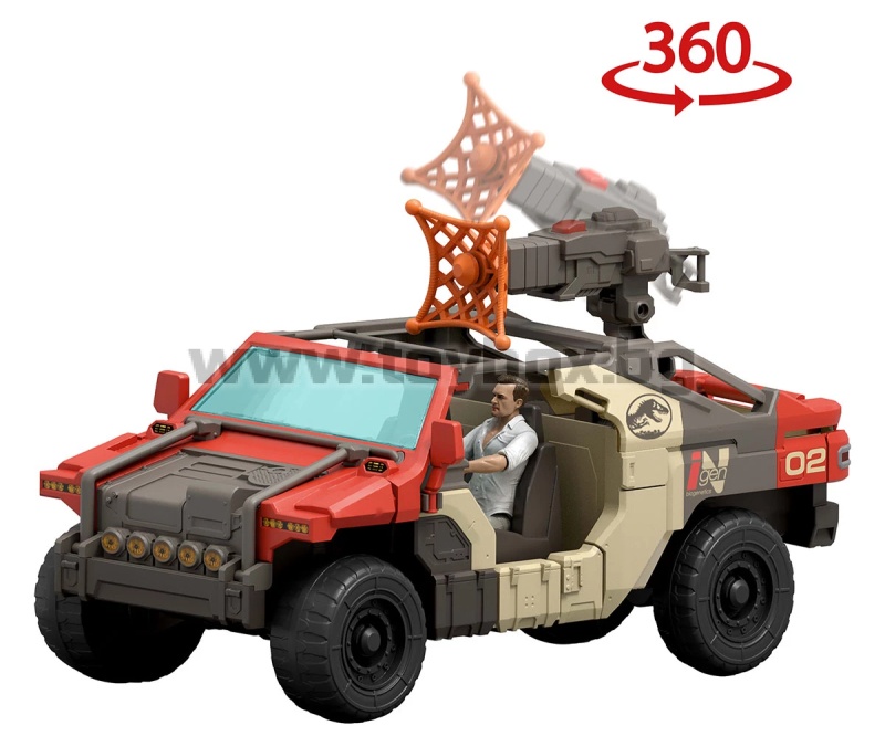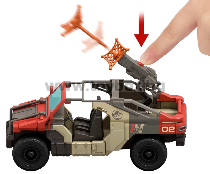 - Готово за действие! Превозното средство е оборудвано със сваляща се кула с бластер, който може да изстрелва два вида снаряди – стрела за събиране на ДНК проби или мрежа за улавяне на динозаври;