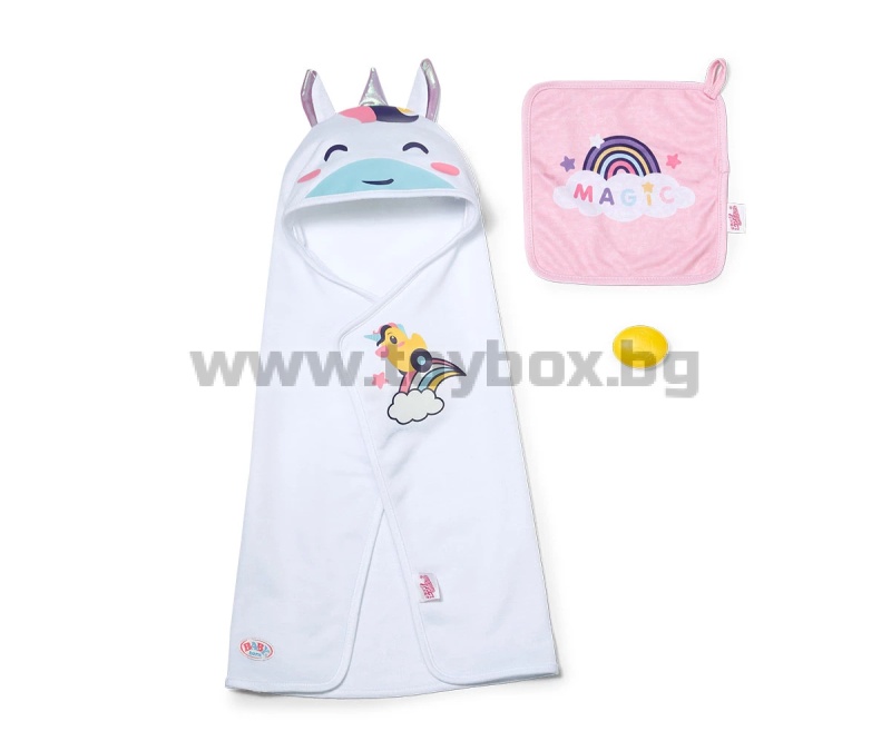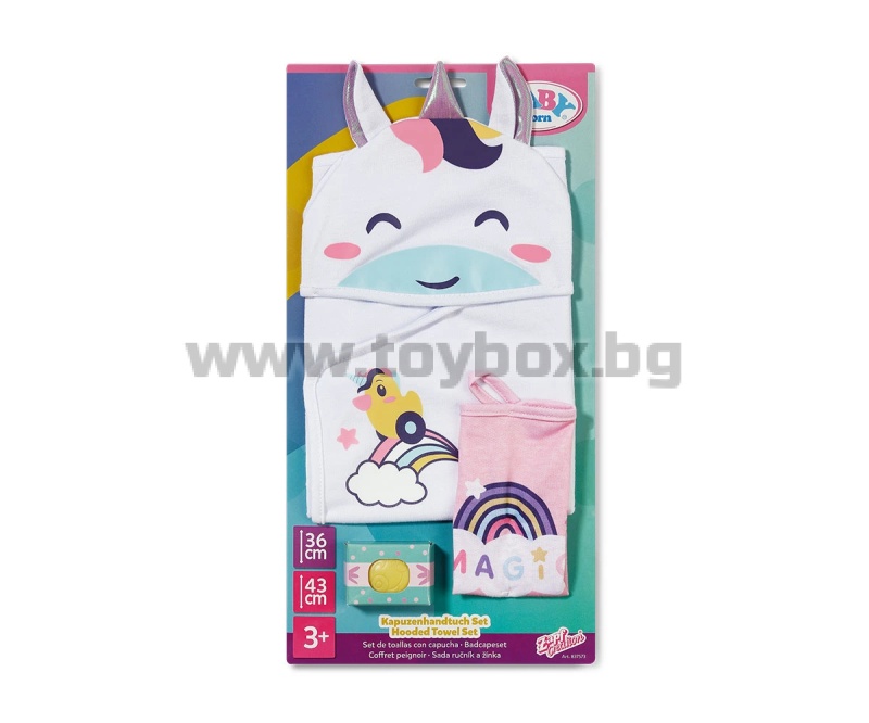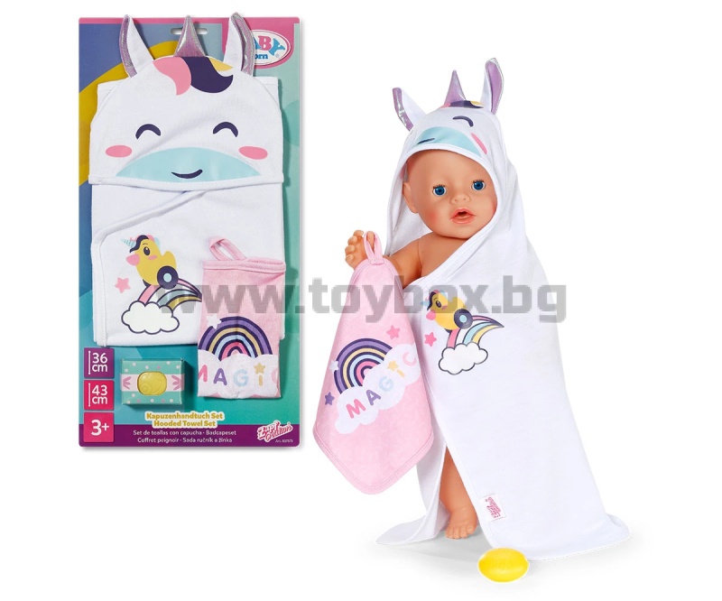 BABY born Комплект хавлия с качулка – уютен и практичен аксесоар за игри с кукли. Комплектът BABY born предлага мека и комфортна хавлия с качулка и подходящи аксесоари, които правят „къпането“ на куклите още по-забавно.