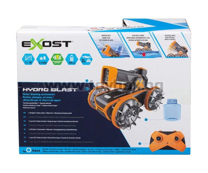 - Водни атаки: EXOST HYDRO BLAST може да изстрелва водата до 5 метра, активирана от разстояние. Водата може да се доставя ръчно чрез резервоара или автоматично, докато колата се движи във водата;