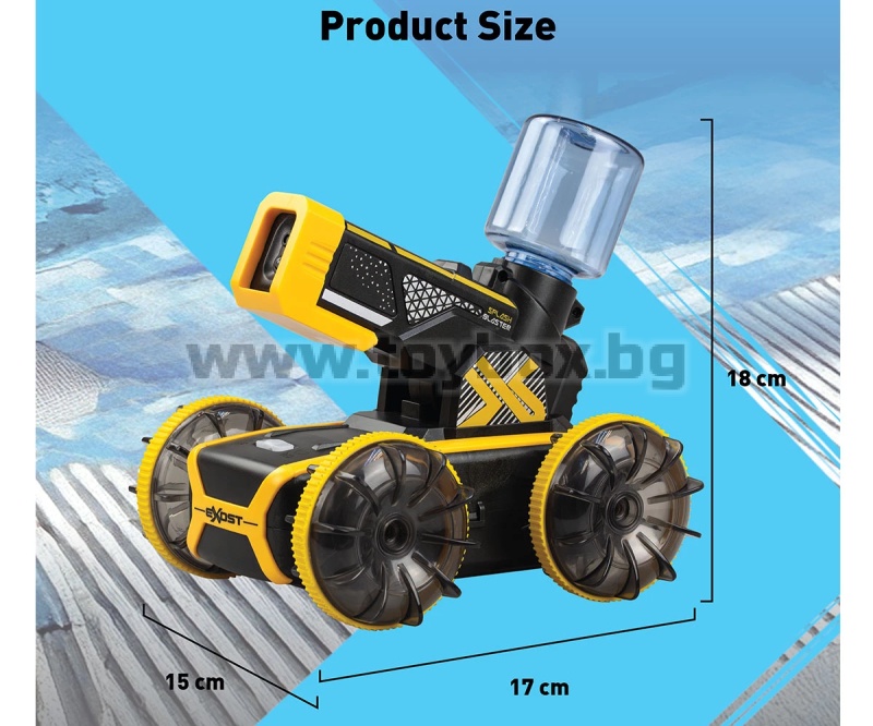 EXOST HYDRO BLAST стреля с вода в 2 различни режима! В сухопътен режим автомобилът може да се движи по земята, да напълни резервоара му с вода и да изстрелва струя до 5 метра с дистанционно управление! Превключи във воден режим, за да плаваш и да се движиш по вода! След всяка водна атака, HYDRO BLAST може автоматично да се презареди с вода отдолу, докато е във водата – безкрайни водни боеприпаси! Честотата 2.4GHz осигурява стабилно радиоуправление до 25 метра. Презареждаемата батерия 3.7V 500 mAh се зарежда напълно за 60 минути и осигурява до 20 минути непрекъсната игра. Препоръчителна възраст: 5+ години.