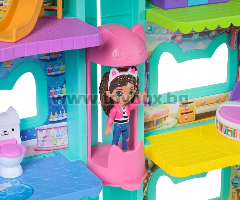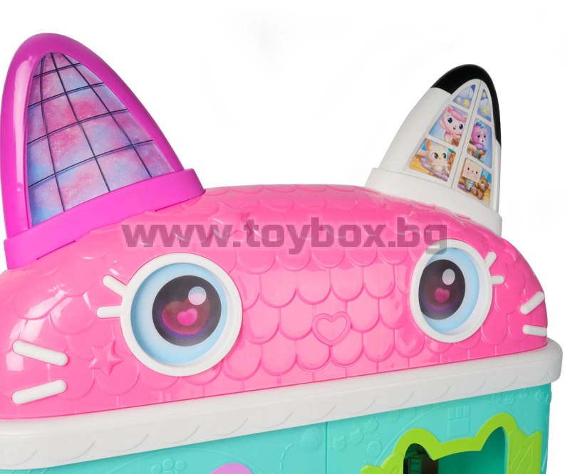 Gabby’s Dollhouse: The Movie – Къщата за кукли с вълшебни котешки приключения! Донеси магията от Gabby’s Dollhouse: The Movie у дома с тази невероятна двуетажна къща за кукли с височина над 60 см! С движещи се очи, 7 тематични стаи и 360° достъп за игра, тази къща е идеалното място за безкрайни котешки приключения!
