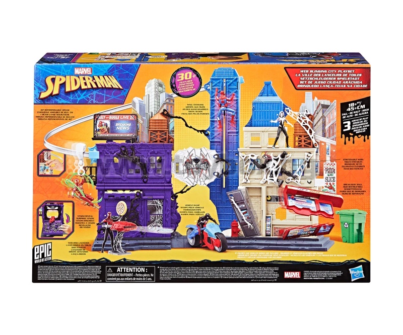 Спаси града от Venom с Marvel Spider-Man Град на паяжините! Този впечатляващ комплект за игра е с височина над 46 см и предлага повече от 30 функции за безкрайни приключения, включително 360-градусова игра.