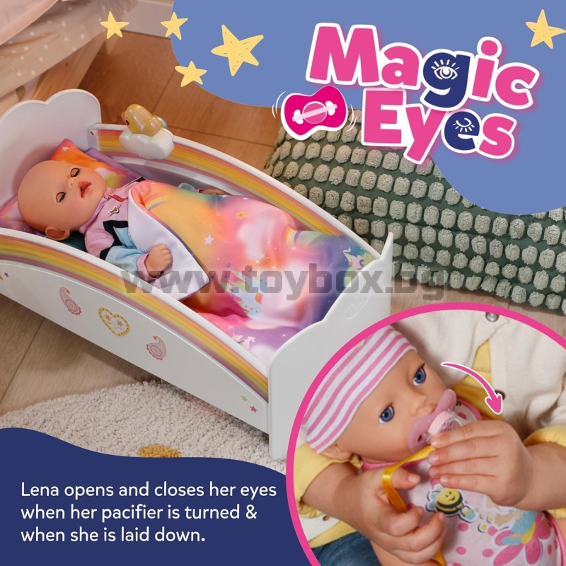- Съдържание на кутията: BABY Born Lena 36 см, включително гащеризон, шапка, гърне, платнена пелена, шише, чинийка и лъжичка, както и вълшебната биберонка и пропуск за раждане.