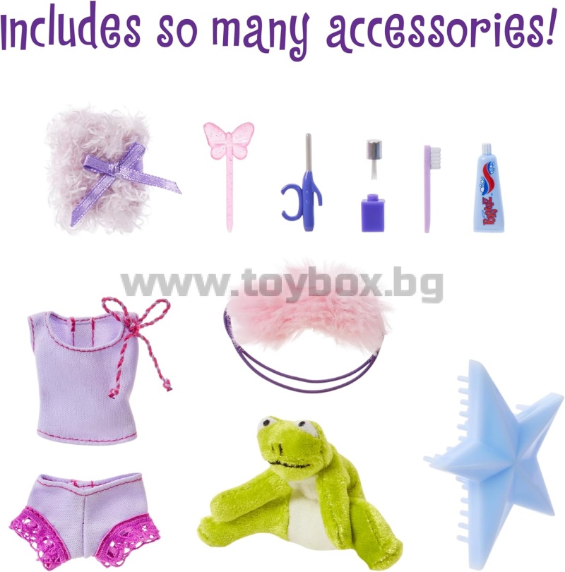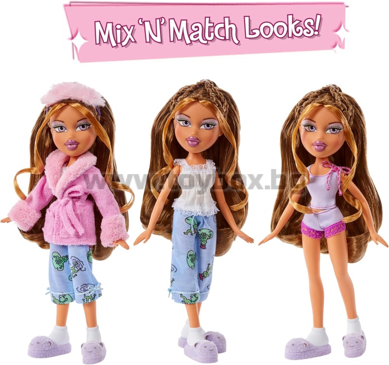 - Включва: 1 модна кукла Bratz Slumber Party, 2 горнища, 2 долнища, 1 халат, 1 маска за очи, 1 плюшена играчка, 1 чифт чехли, 1 дневник, 1 химикалка, 1 бутилка лак за нокти, 1 четка за зъби, 1 паста за зъби, 1 маша, 1 щипка за коса, 1 четка за коса и 1 плакат.