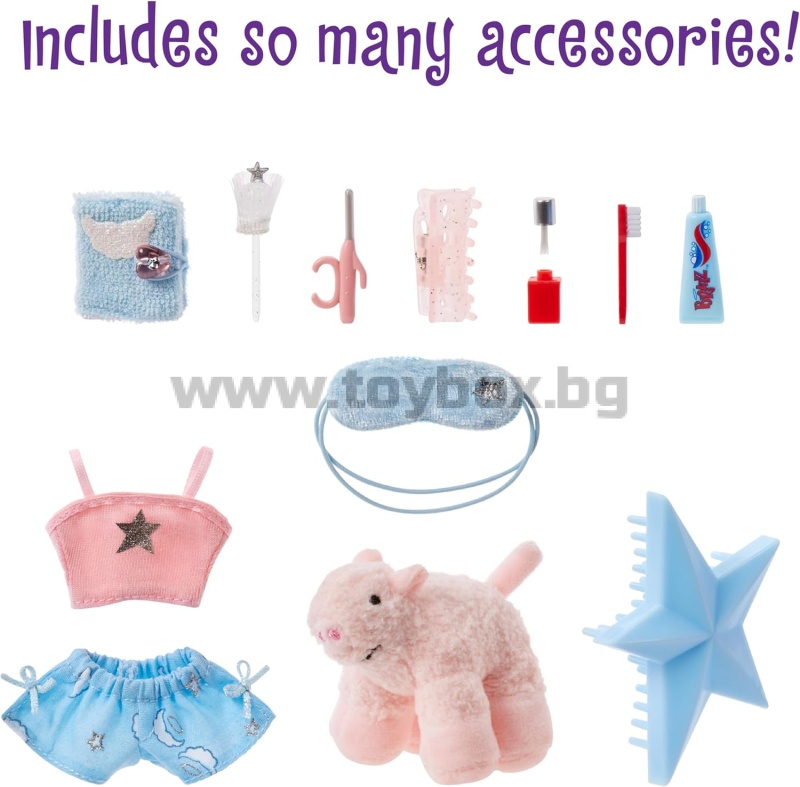 - Включва: 1 модна кукла Bratz Slumber Party, 2 горнища, 2 долнища, 1 халат, 1 маска за очи, 1 плюшена играчка, 1 чифт чехли, 1 дневник, 1 химикалка, 1 бутилка лак за нокти, 1 четка за зъби, 1 паста за зъби, 1 маша, 1 щипка за коса, 1 четка за коса и 1 плакат.
