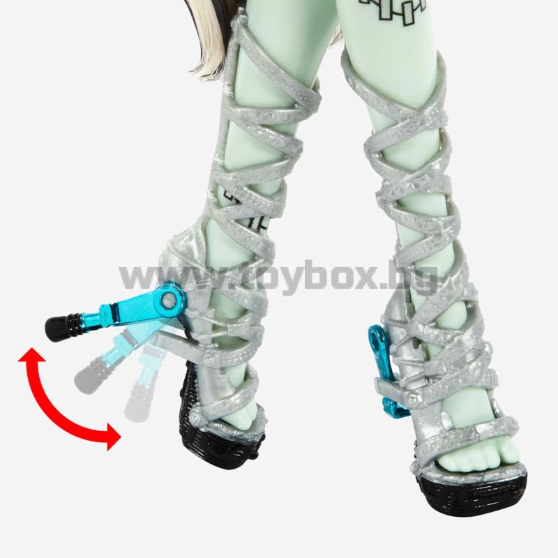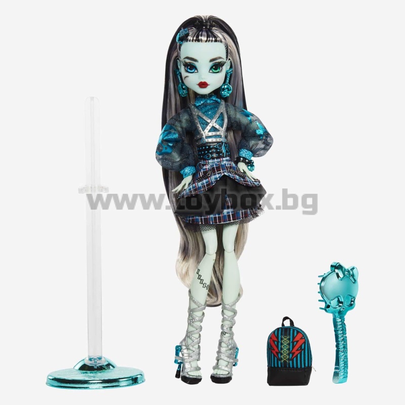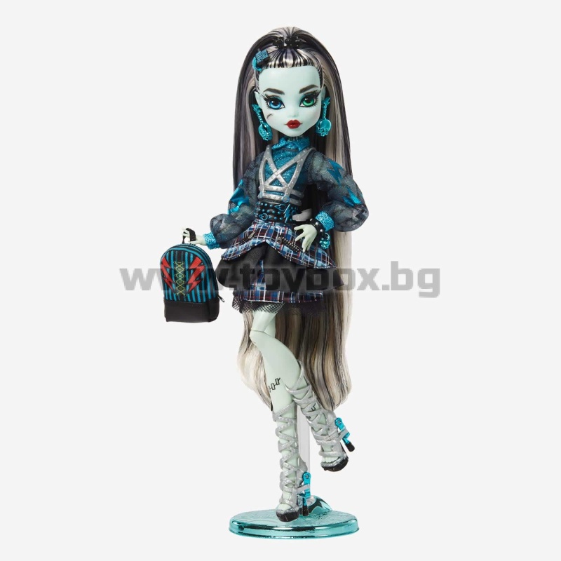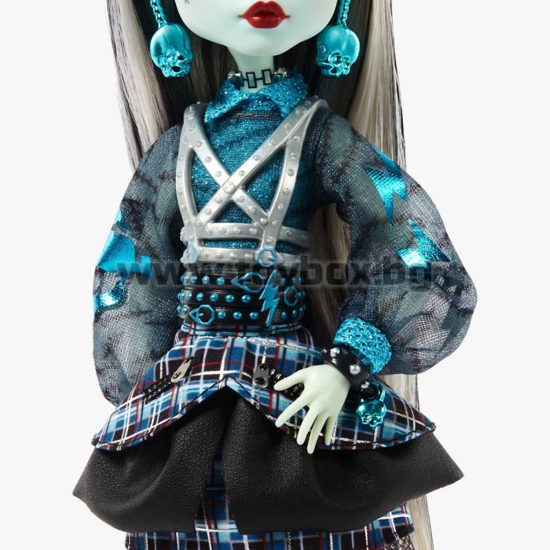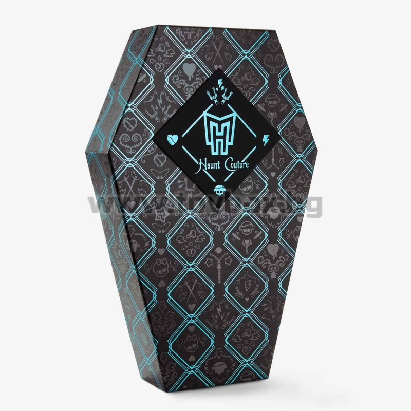 Оригиналните духове от Monster High се завърнаха в завладяващо шикозни, готови за подиума версии на емблематичните си визии. Куклата Frankie Stein Haunt Couture зашеметява с електризиращ трикомпонентен модел, включващ емблематичен кариран принт, детайли с ефект на криминале и обувки с електрическо закопчаване и ток с дърпащ се ток.