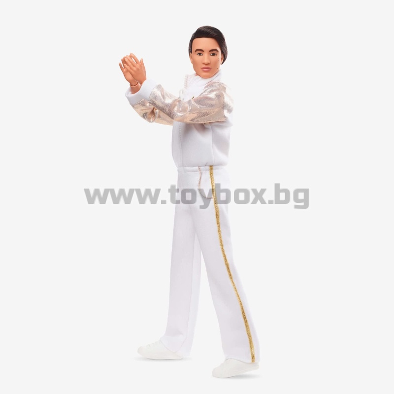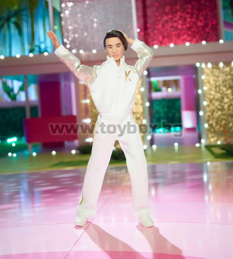 Кен е наистина впечатляващ в своя бяло-златист диско анцуг. Вдъхновен от една визия от „Барби: Филмът“, неговият стил се отличава с работещ цип и истински джобове. Металният акцентен плат добавя луксозен детайл към кинематографичния му вид. В чест на „Барби: Филмът“, тази кукла Кен е чудесен подарък както за фенове, така и за колекционери.