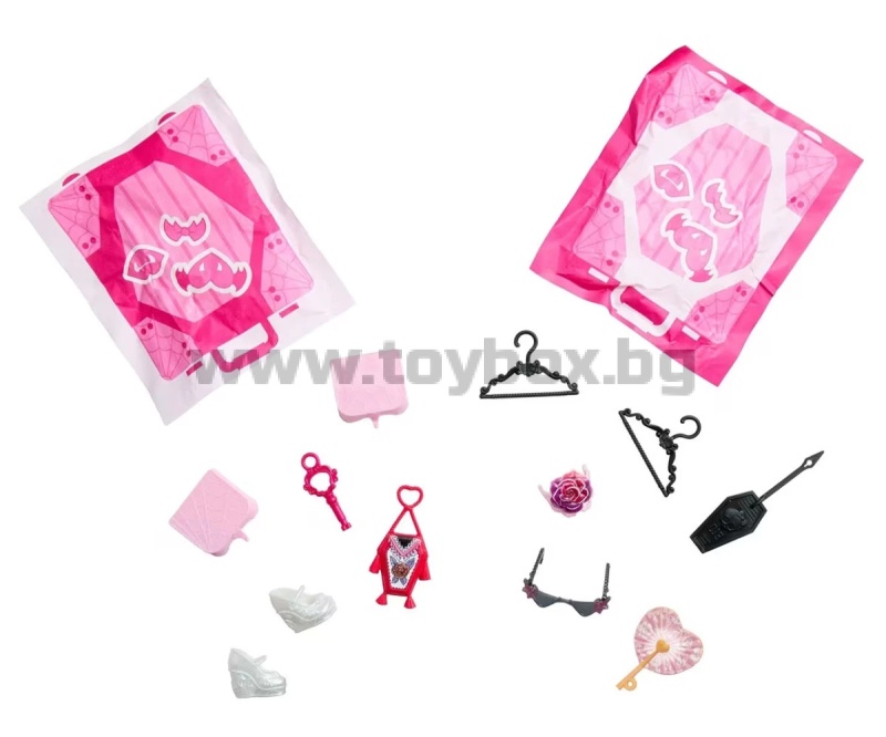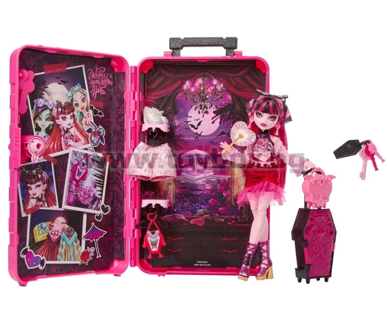 - В куфара се крие вампир и 19 изненади… Първа стъпка? Използвай ключа, скрит отпред на куфара, за да отвориш вратата и да разкриеш Дракулаура в „зъбато“ курортно облекло!