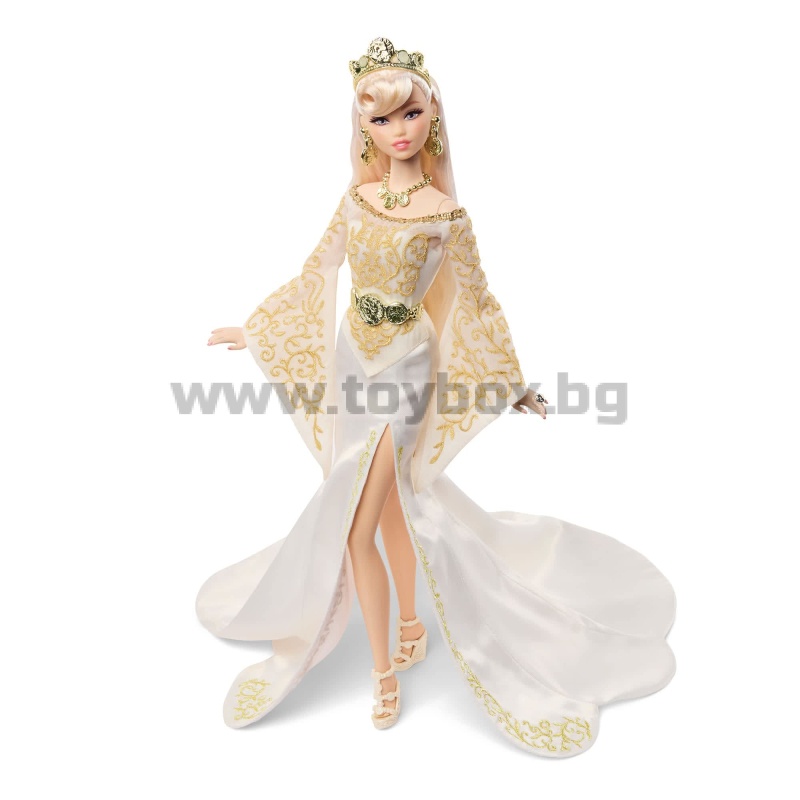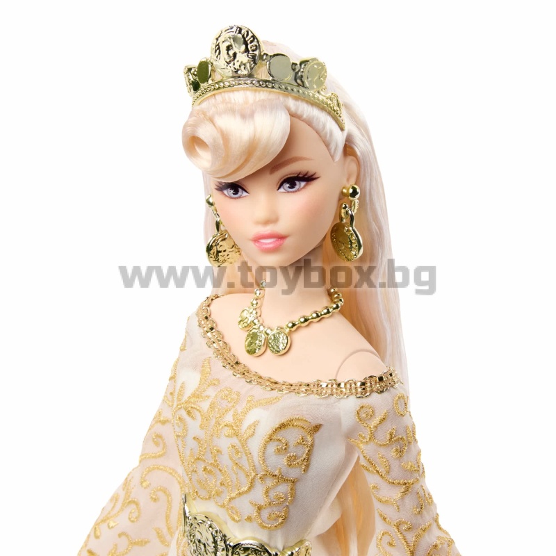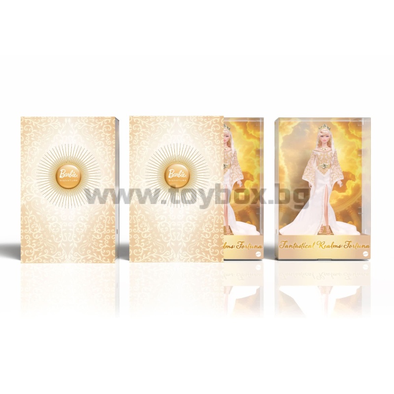 Запознайте се с богиня от съвсем нова равнина: Фантастичните Царства. Дадохме на членовете на Barbie Club 59 възможността да избират какъв тип фентъзи кукла искат да добавят към колекциите си. Техните гласове доведоха до тази царствена суперзвезда, вдъхновена от богинята Фортуна. Поразителна фигура, тя е облечена в ефирна бяла рокля с бяло-златни щрихи от глава до пети. Роклята е с драматични ръкави тип „камбана“ и висока цепка, а аксесоарите пресъздават вида на златни монети, крайъгълен камък на богинята, на която е базирана.
