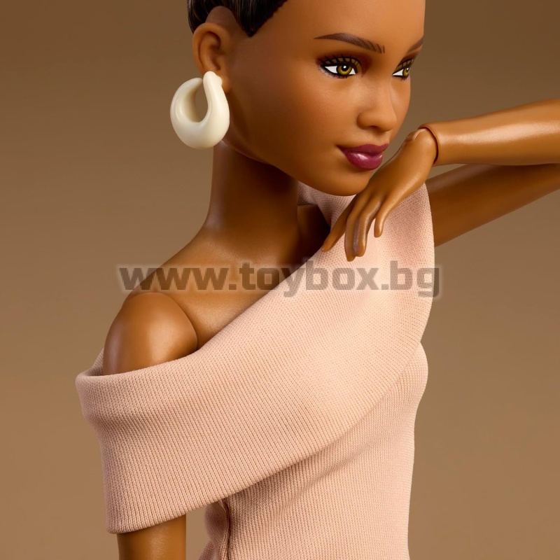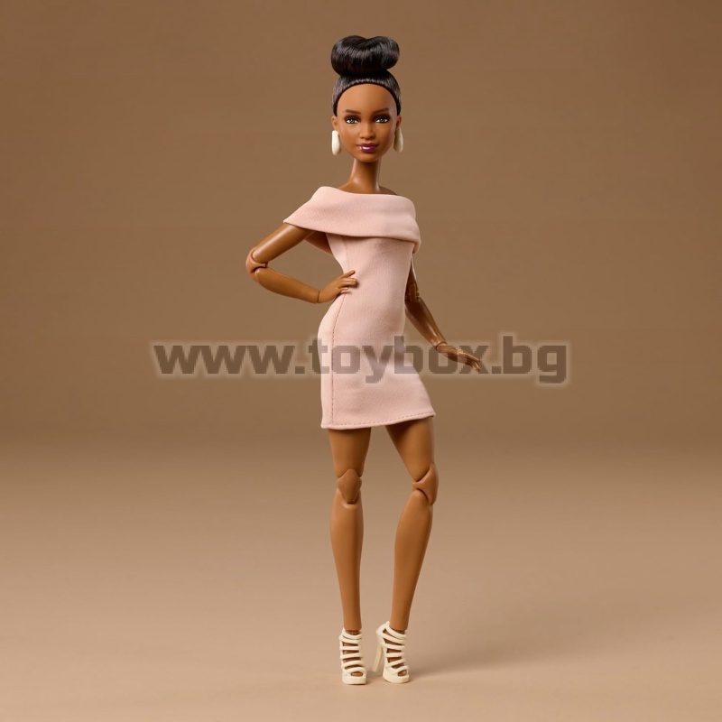 • Куклата Barbie Basics Модел 08 владее шикозния минимализъм в елегантна светлокафява рокля с драматично деколте и кремави обувки на висок ток с презрамки.