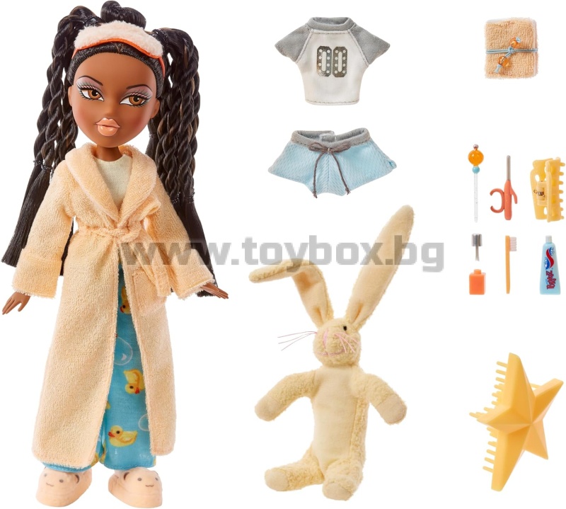 - ВКЛЮЧВА: 1 кукла Bratz Slumber Party, 2 горнища, 2 долнища, 1 халат за баня, 1 маска за очи, 1 плюшена играчка, 1 чифт чехли, 1 дневник, 1 химикалка, 1 бутилка лак за нокти, 1 паста за зъби, 1 маша за коса, 1 пинсета, 1 четка и 1 плакат.