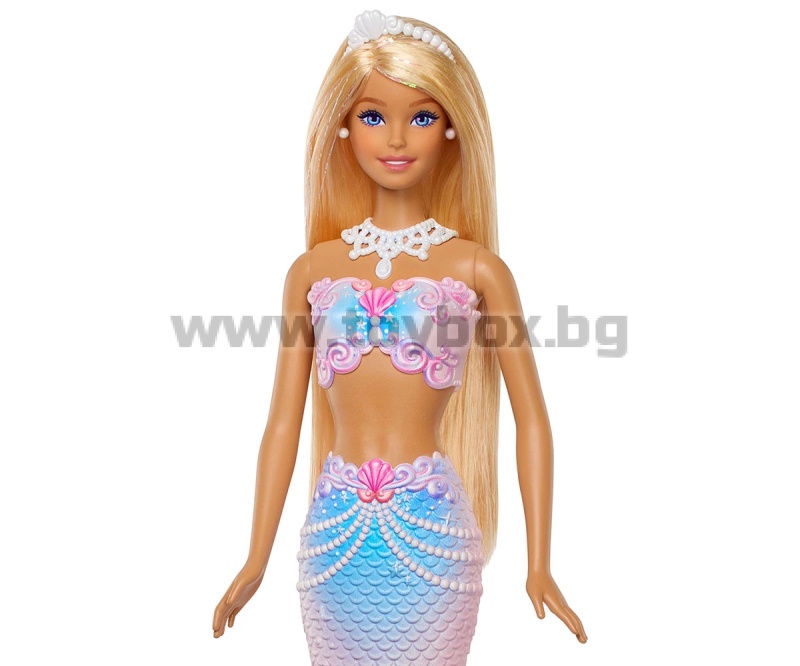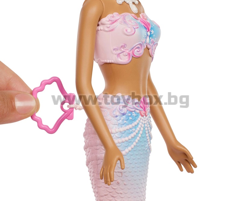 - Куклата Barbie русалка впечатлява с фантастичен дизайн - розова опашка, корсаж с детайли, вдъхновени от перли, и блестящ кичур в косата.
