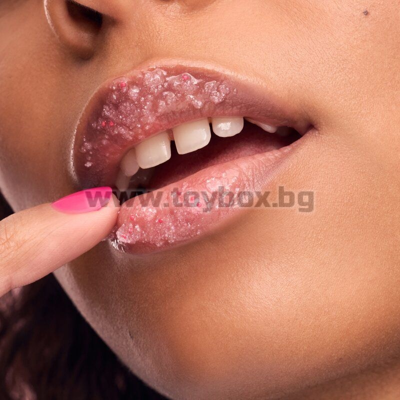 Ексфолиращ скраб за устни в розов нюанс с преливащи се блестящи ефекти и розови ексфолиращи частици за гладки, блестящи устни